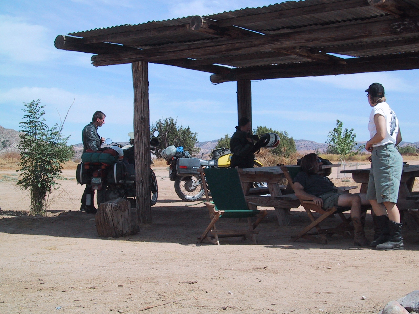 Dave Doudna and Noemi Berry arrive on their GS's, Charles Statman tries to ignore them, Sara Hammer looks on.