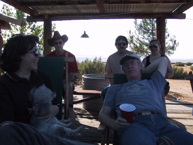 Roland speaks sagely, with hecklers behind. Left to right: Ellen Carrico, Ed Milich, Ed Hackett, Roland Smith, Beth Dixon - note that only ONE person in this picture actually arrived at the Joust by motorcycle, and its also his first Joust (Ed).
