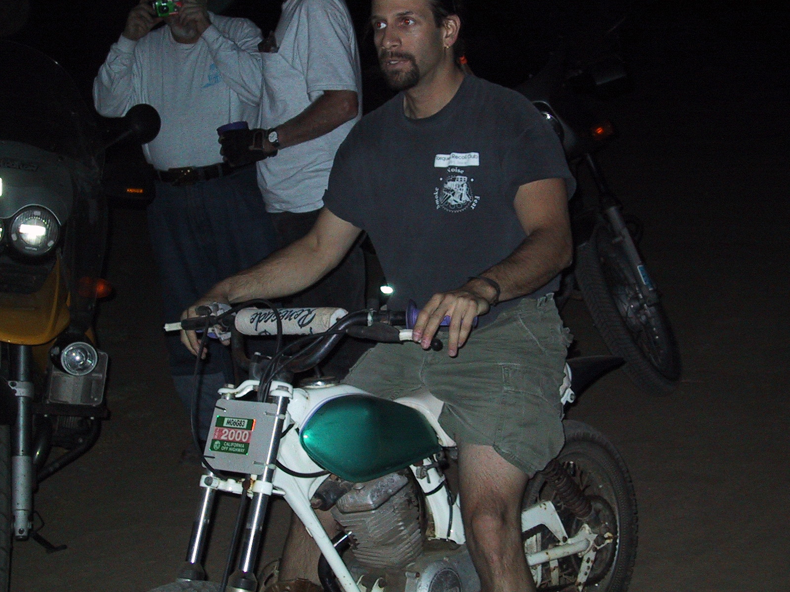 Charles Statman (Also known as Crazy Charles per Beth Dixon) checking out Mark Alpin's ("I'M NOT IN CHARGE, I'M NOT RESPONSIBLE") tiny and LOUD dirtbike.